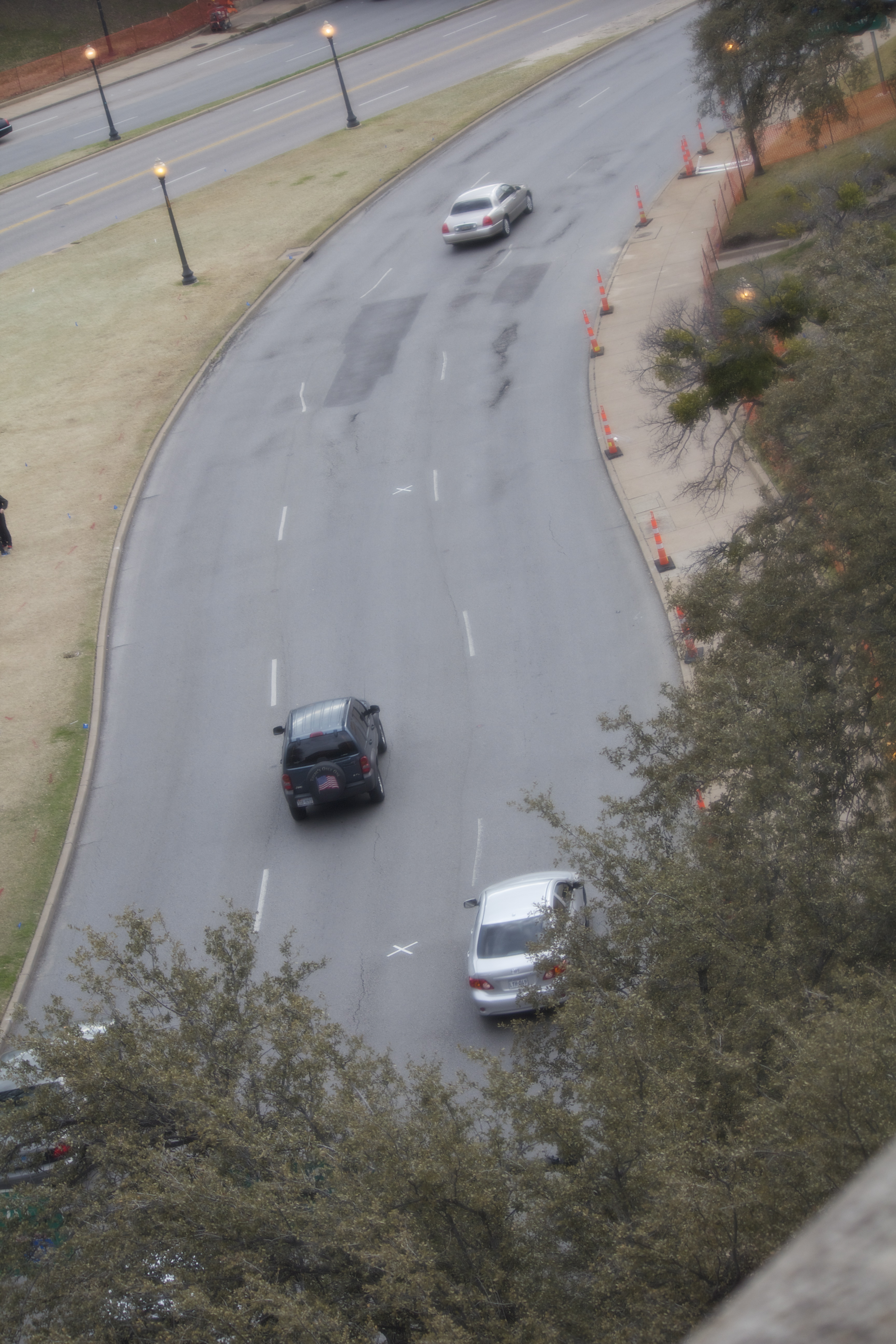 The Texas School Book Depository driving up Houston St. Same direction in which JFK rode.