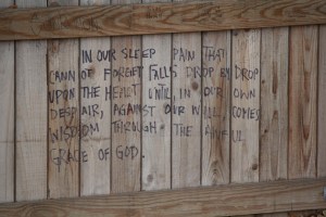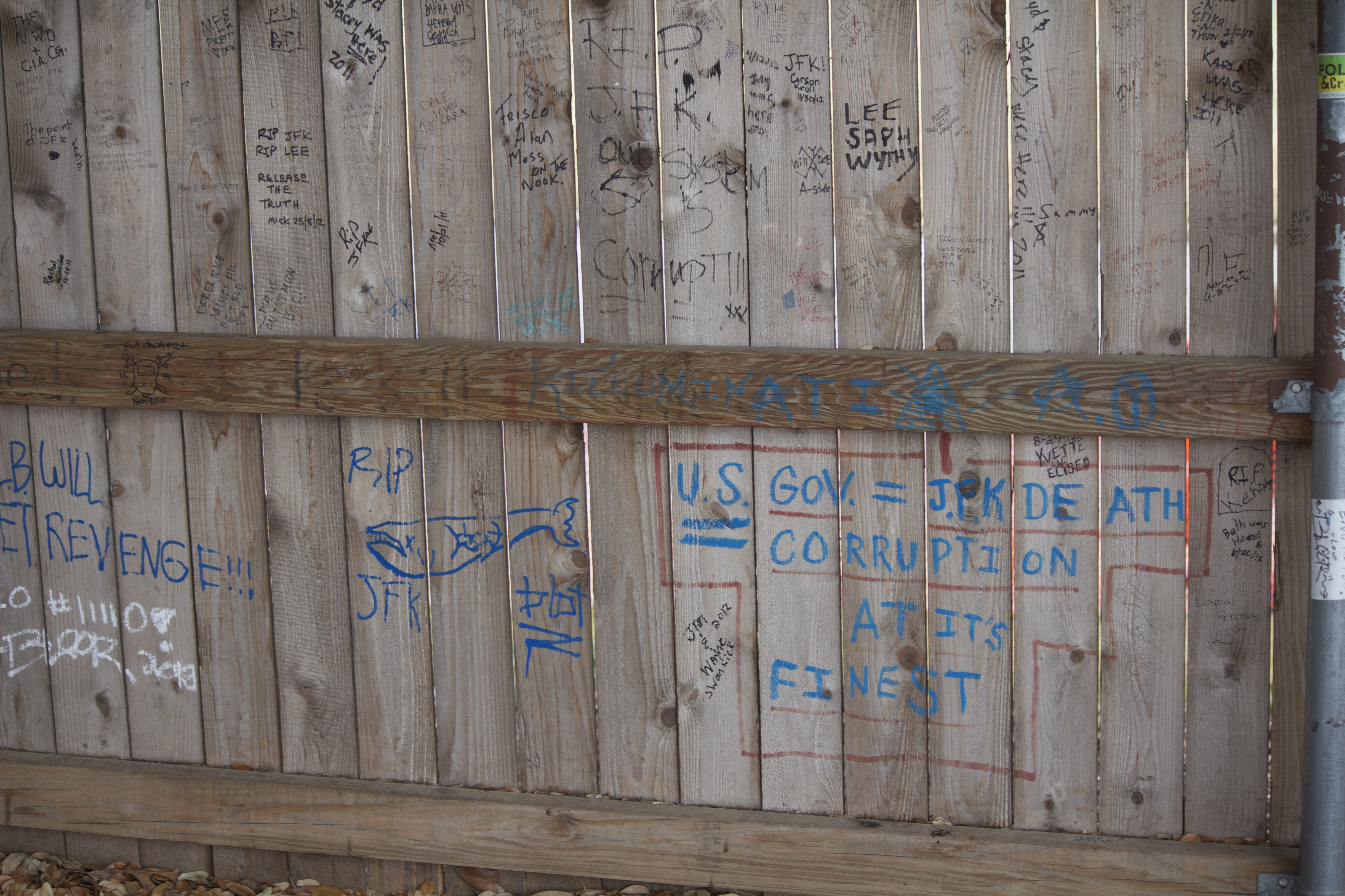Graffiti on the parking lot side of the Grassy Knoll fence.